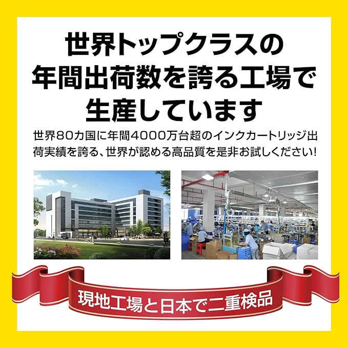 【国際基準を満たす高品質】互換インクの品質に不安を感じている方も心配不要です!国際規格ISO9001(品質)ISO14001(環境)の両方のISOを取得した優良工場にて製造し、厳しい管理体制で品質をチェック。現地工場と日本国内での二重検品により不良率もゼロに近く、安心してお使いいただけます。