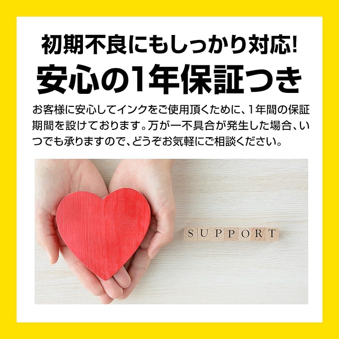 【メーカー.1年】お客様に安心してインクをご使用いただくために、商品ご購入から1年以内に限り、メーカーにてしっかりサポートさせていただきます。初期不良等がございましたらサポートまでご連絡ください。※.任意賠償に準ずる。故意による故障・リセッター使用などによる故障・経年劣化による故障は対象外です。