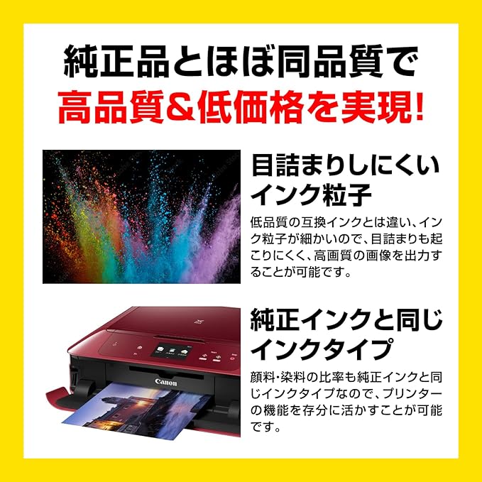 【大容量キヤノンプリンター用互換インク】お財布に優しく経済的に印刷できるのに、純正インクと変わらない高品質の仕上がり!くっきり・はっきり印字でき、色味も鮮やか。インクの粉の質にもこだわり、目詰まりやかすれが起こりにくい微粒子タイプを採用しました。