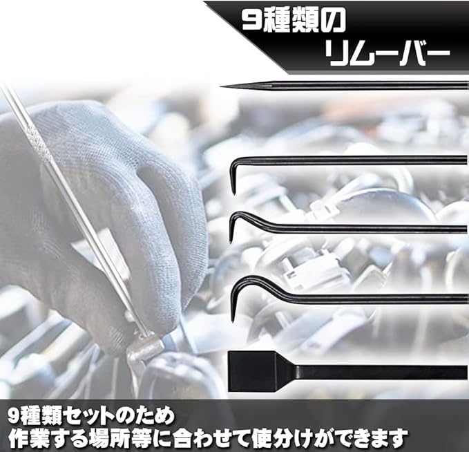 オイルシールの取り外しやパッキンの交換など多用途でご使用いただけるリムーバーセットです。9種類のリムーバーをセットになっているので用途に応じてご使用いただけます。