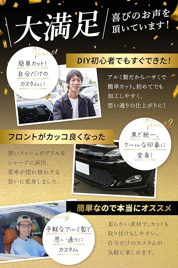 【フロントグリルネット】いまや車のデザインの核となっているのはフロントグリルです。世界総フロントグリルブームといっても過言ではありません。 フロントグリルをカスタムするだけで自分だけのスタイルをアピールすることができます。