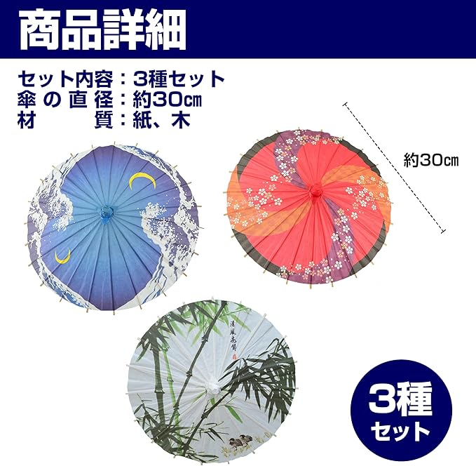セット内容:3種セット 傘の直径:約30cm 材質:紙、木 ※モニターの環境により、色の見え方に若干差が生じる場合があります。