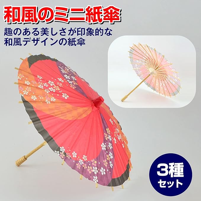小さくてかわいい:傘の直径が約30cmのとても小さくてかわいらしいサイズ感の紙傘です。飾り棚やテーブルの上などにも置きやすい大きさなので、使いやすくて便利です。3種類の紙傘が揃ったセットなので、置きたい場所に合わせて使い分けもできます。