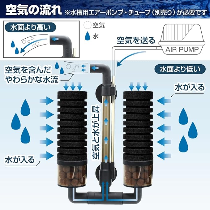 エアーリフト方式で空気を含んだやわらかな水流を生み出し、水槽内に効率的に酸素を供給します。
