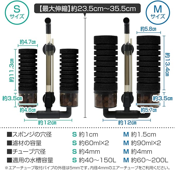 【スポンジ穴径(約)】S:1cm M:1.5cm 【濾材容量(約)】S:60ml 2 M:90ml 2 【チューブサイズ(約)】4mm 【適応水量(約)】S:40L~150L M:60L~200L ※交換用スポンジは輸送費を抑える為、圧縮してお届けします。しばらくすると元の形状に戻るのでご安心ください※