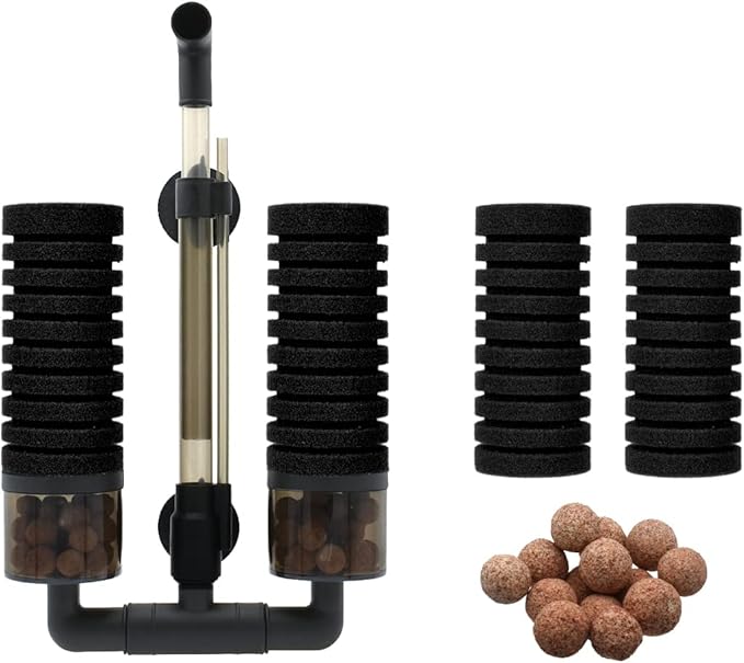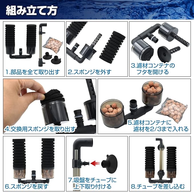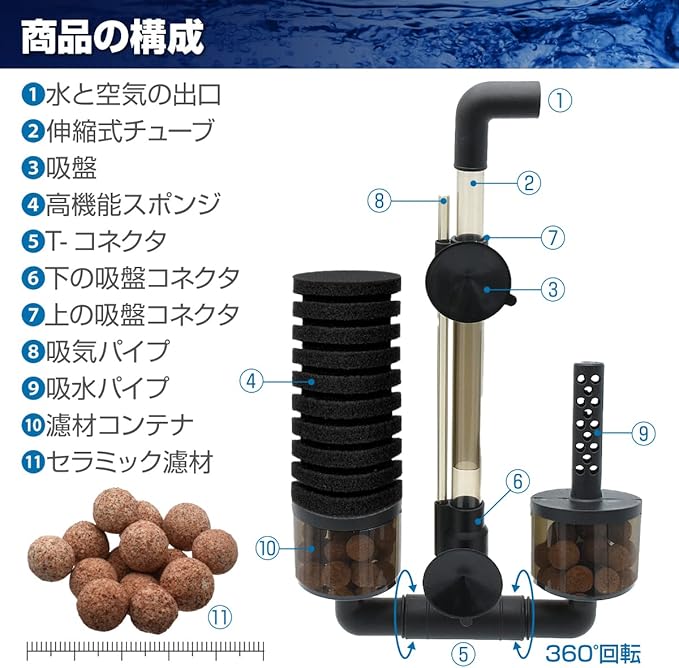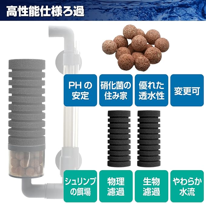 スポンジフィルターで物理的な濾過を行い、コンテナ部の濾材がバクテリアの住み家となり生物濾過を行います。