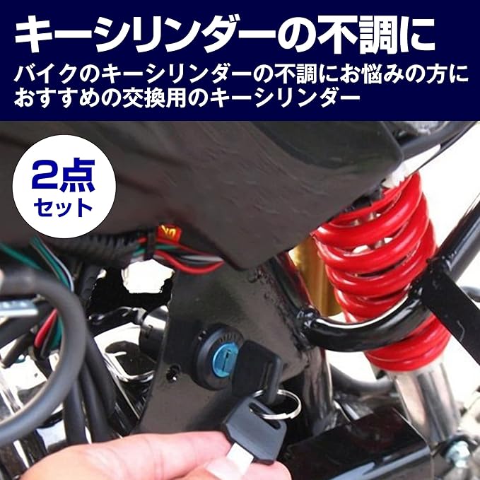 キーシリンダーの不調に:バイクのキーシリンダーの不調にお悩みの方におすすめの交換用のキーシリンダーセットです。ブラックカラーをベースとしたキーシリンダーとなっています。