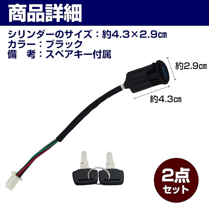 セット内容:2点セット シリンダーのサイズ:約4.3 2.9cm カラー:ブラック 備考:スペアキー付属 ※モニターの環境等により、色の見え方に若干差が生じる場合がございます。