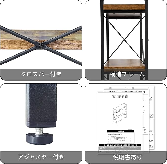 ★【商品サイズ】幅90 奥行30 高さ91cm。棚板間の高さ:36cm。 棚板の厚さ:3cm。 耐荷重(約):棚板各45kg。 材質:MDF・スチール。色:古木色
