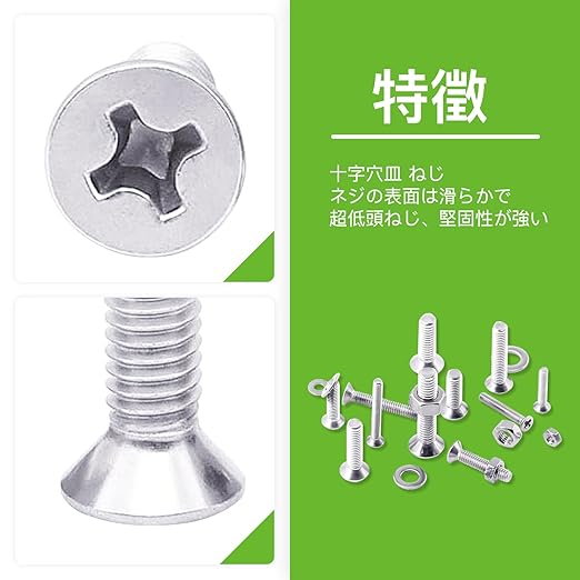 【十字穴付き ねじ 特徴】上面が平らで座面が円錐形という形状の頭をしています。皿小ねじでは頭部を出っ張らせたくないとき、締結する部材と面一にしたいときに使います。 ただし、座面の円錐形に合わせた「ザグリ加工」を、あらかじめ部材に施すことが必要です。