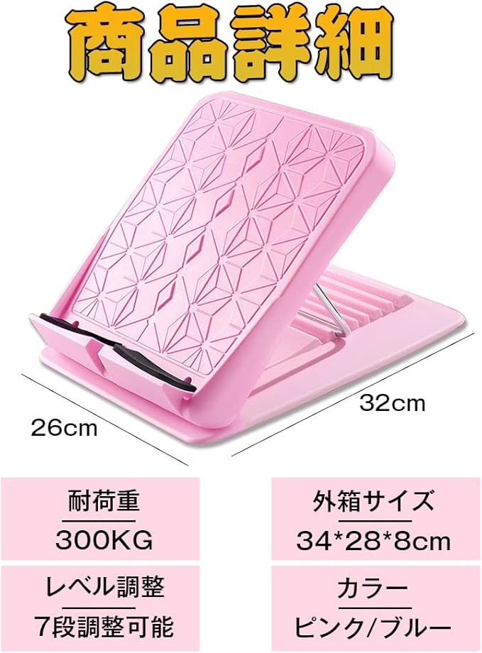 本体サイズ:32*26*6cm 梱包サイズ: 34*28*8cm ネットウェート:1kg グロスウェート:1.3kg 素材:ABS樹脂、スチール カラー:ブルー/ピンク 耐荷重:300kg セット内容:本体*1、日本語取扱説明書*1、ボックス*1