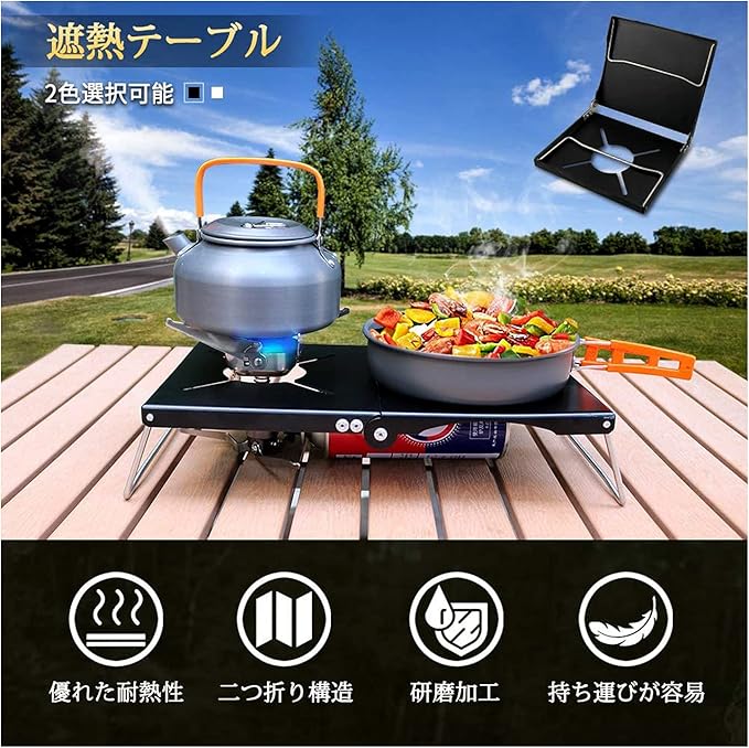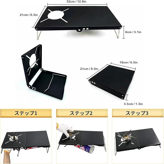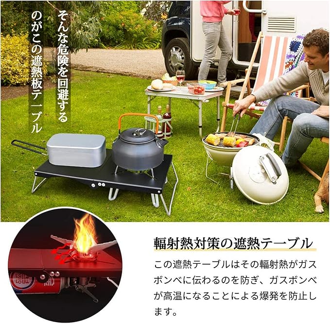 【一台多役&5種類バーナー対応】:折りたたみ式テーブルと四種類バーナー兼用な遮熱板です。アウトドアの定番道具としてのSOTO st310バーナーの使用者のため、こちらの遮熱テーブルが誕生されました。しかも、SOTO st310だけではなく、SOTO st330、FORE WINDS FW-MMS01、イワタニジュニアコンパクトバーナー、trangia(トランギア) .バーナー及び同じ形の.バーナーも取付できます。ステンレス製の遮熱板は遮熱性が高く、カセットボンベ上部のデッドスペースがミニテーブルとしてつかえます。しかもゴトクもきちんと安定させられます、クッキングしながら、お皿やカップなどは置くことができます。