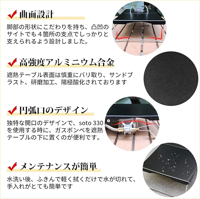【安心のデザイン】脚部の底辺部分デザインは平行ではなく、曲面の設計にしました。曲面により、脚部2本合わせ支点が4か所になりもっとアウトドアの複雑使用環境に適応されます。加えて、独特な開口のデザインで、soto ST-330を使用する時に、をst330遮熱テーブルの下に置くのが便利です。バーナーを使っているときはスペースを有効に使えて便利。