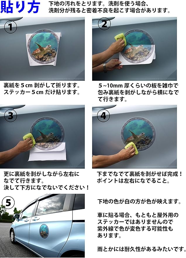 裏紙を剥がしながら圧着して貼ります。わりと強めの粘着ステッカーです。下地の色が白い部分に貼ると色合いが鮮やかに仕上がります。濃い色の下地に貼ると色も暗い感じになります。
