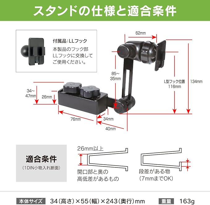 ホルダー本体サイズ:121~198(高さ) 77~125(幅) 38(奥行)mm