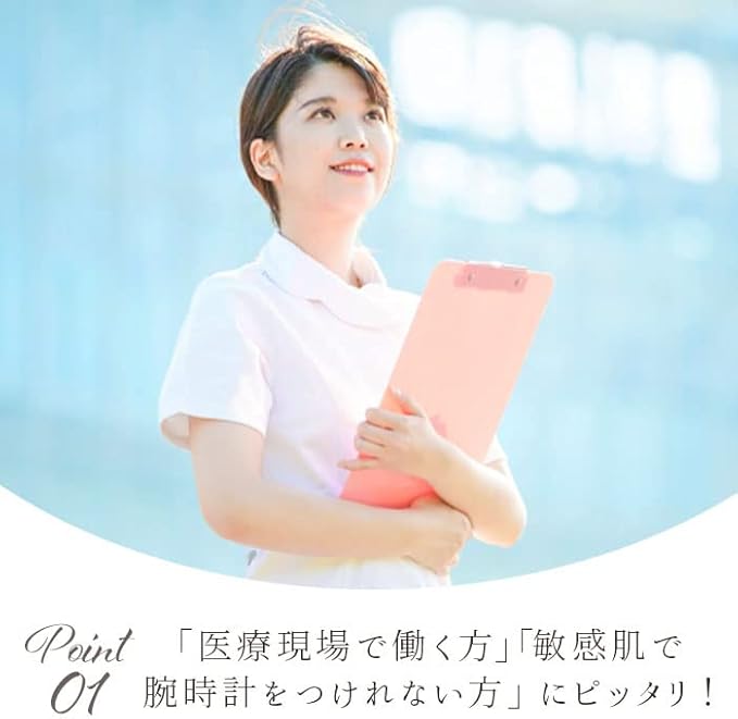 現場で働く方や腕時計をつけられないお仕事の方、腕時計の金属部分が肌に直接触れるのが心配・・・という敏感肌の方にもピッタリ。