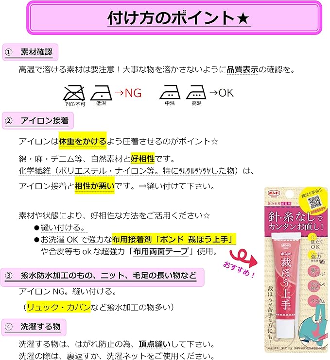 食べこぼしなど、汚れてしまったお洋服のシミ隠しや、破れや穴あきの補修に。