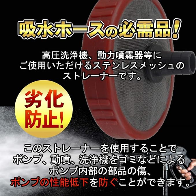 このストレーナーを使用することでポンプ、動噴、洗浄機をゴミなどによるポンプ内部の部品の傷、ポンプの性能低下を防ぐことができます。