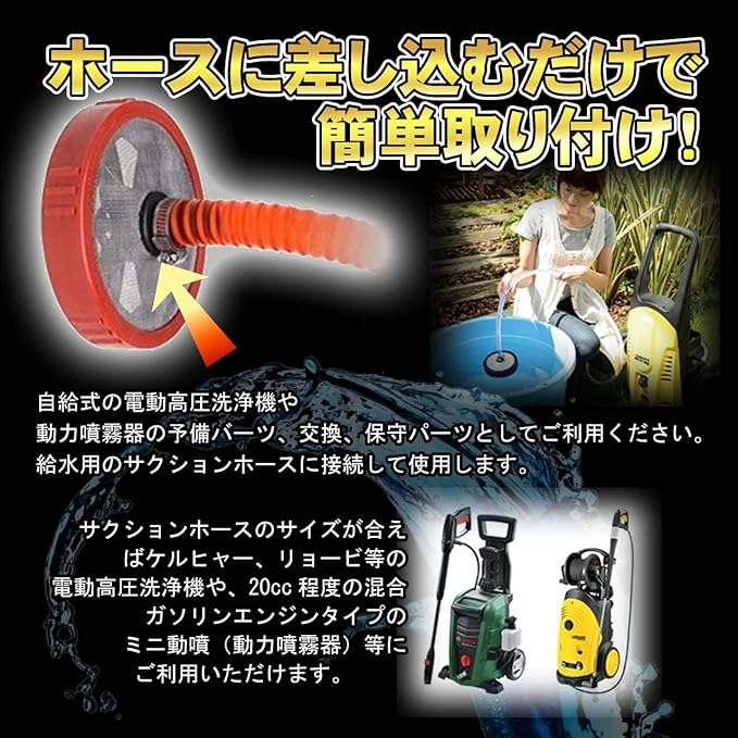 サクションホースのサイズが合えばケルヒャー、リョービ等の電動高圧洗浄機や、20cc程度の混合.エンジンタイプのミニ動噴(動力噴霧器)等にご利用いただけます。