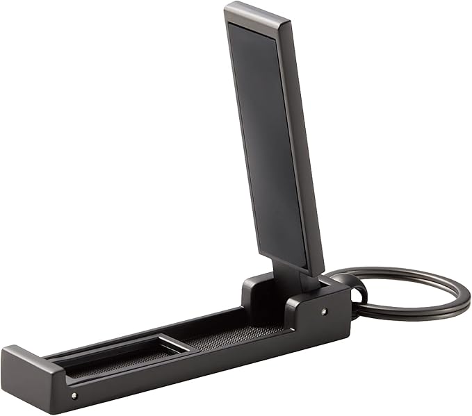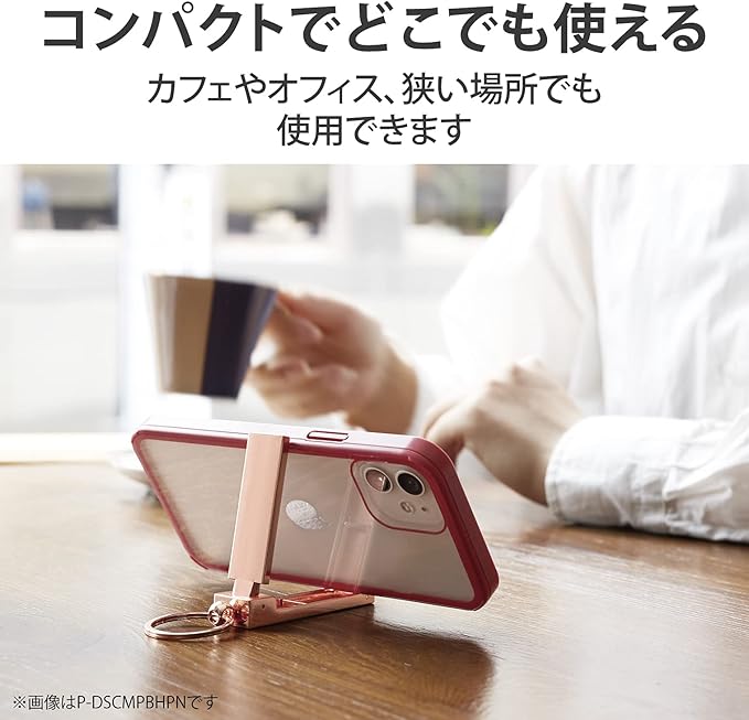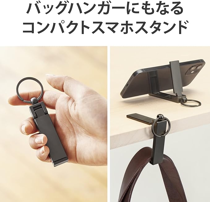 折りたたんでコンパクトに持ち運びでき、出先でも鞄を床置きしないバッグハンガー機能付きのスマートフォン用コンパクトスタンドです。