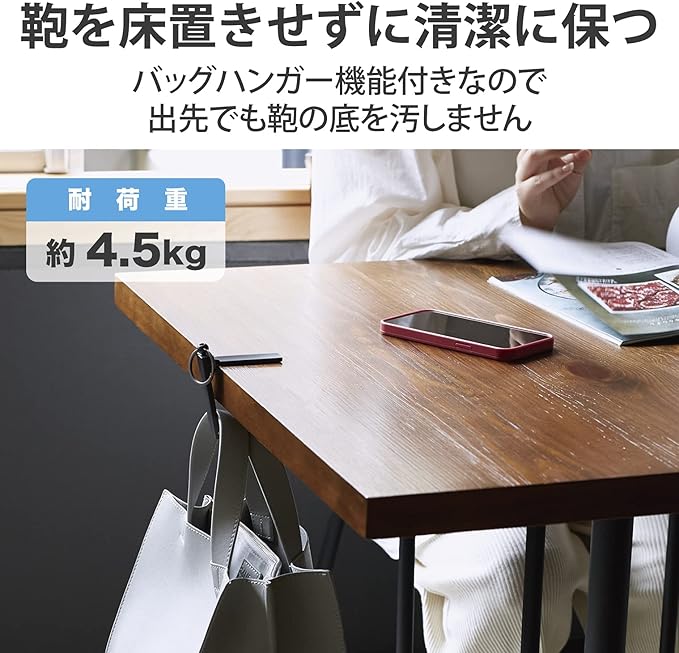 バッグハンガー機能付きのため、出先でも鞄を床置きせずに清潔に保ちます。
