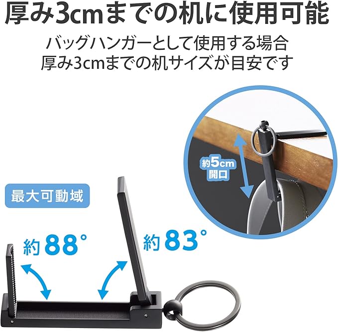 最大約5cmの開口のため、使用できる机などの厚みは3cmまでが目安です。