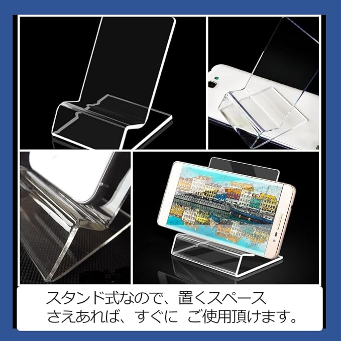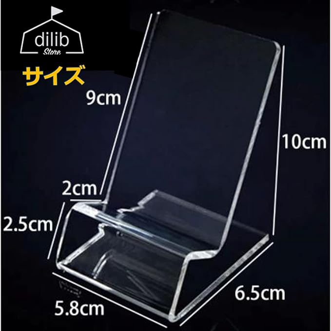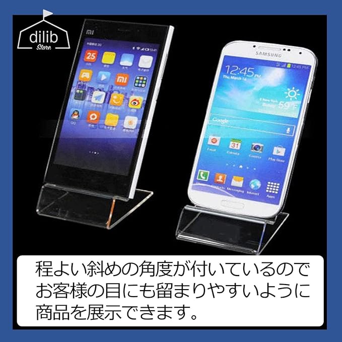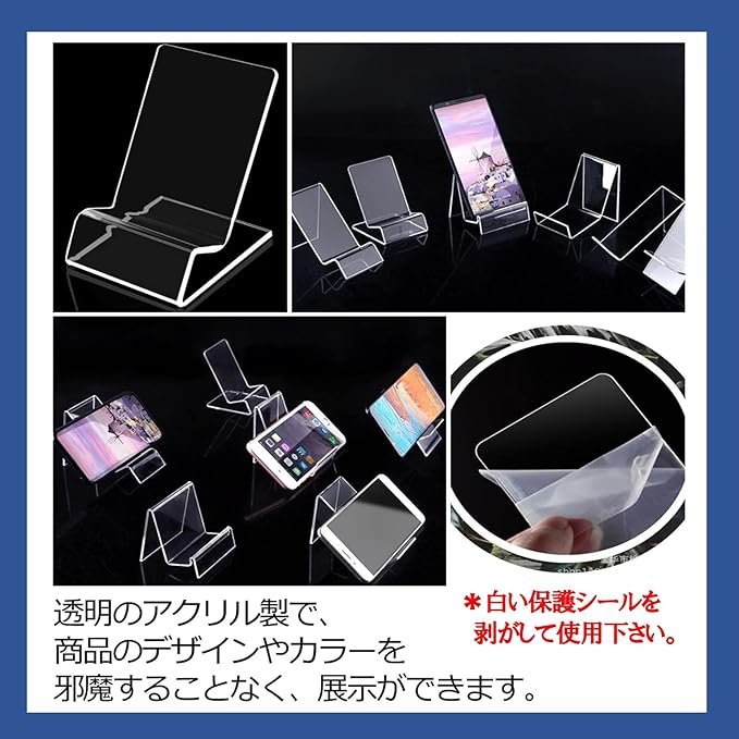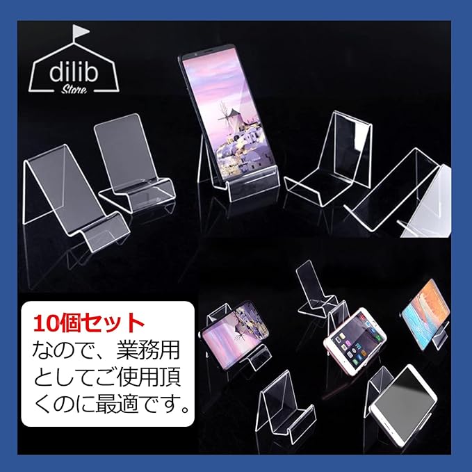 スマホなどを立て掛けておくことができる、アクリル製のディスプレイスタンドです。10個セットなので、業務用としてご使用頂くのに最適です。 透明、または半透明のアクリル製なので、商品のデザインやカラーを邪魔することなし!商品の良さ、特徴を引き立てるような展示ができます。