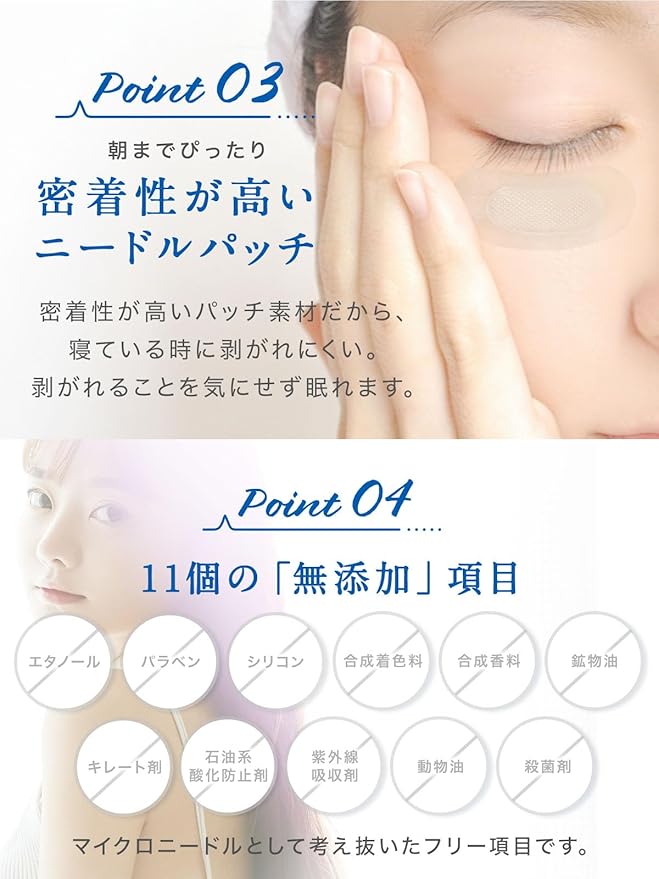 ✅【溶解型マイクロニードル技術】2枚で約1000枚の針美容成分が凝縮 洗顔後、化粧水で肌を整えてからニードパッチを使用します。目元 目の下 口元の気になる部分にシートを張ります。優しく2~3回抑えて肌と密着させてください。美容成分は寝ている間に5~6時間をかけてゆっくり浸透します。張ったままお休みになり翌朝剥がしてください。