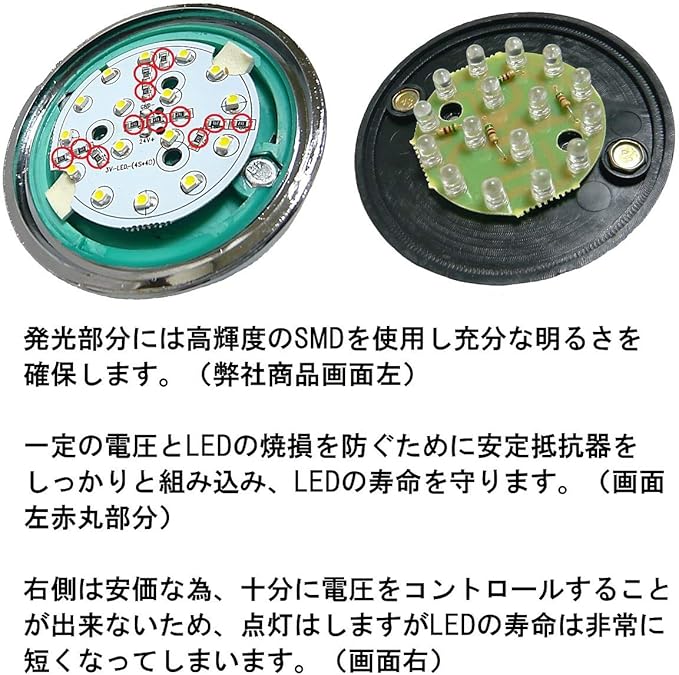 ※防水につきまして。 稀にロックビスのねじ込み角度によりメッキリングが僅かに斜めにずれてしまいゴムリングの防水性が保てない場合がございます。その際は一度ロックのビスを外していただきメッキリングを外し、再度メッキリングが斜めにならないよう締め付けてください。 稀にロックのビスをねじ込むとメッキリングが斜めにずれてしまう場合がございます。その際はメッキリングをしっかり締めていただきロックビスは使用しないようお願い致します。