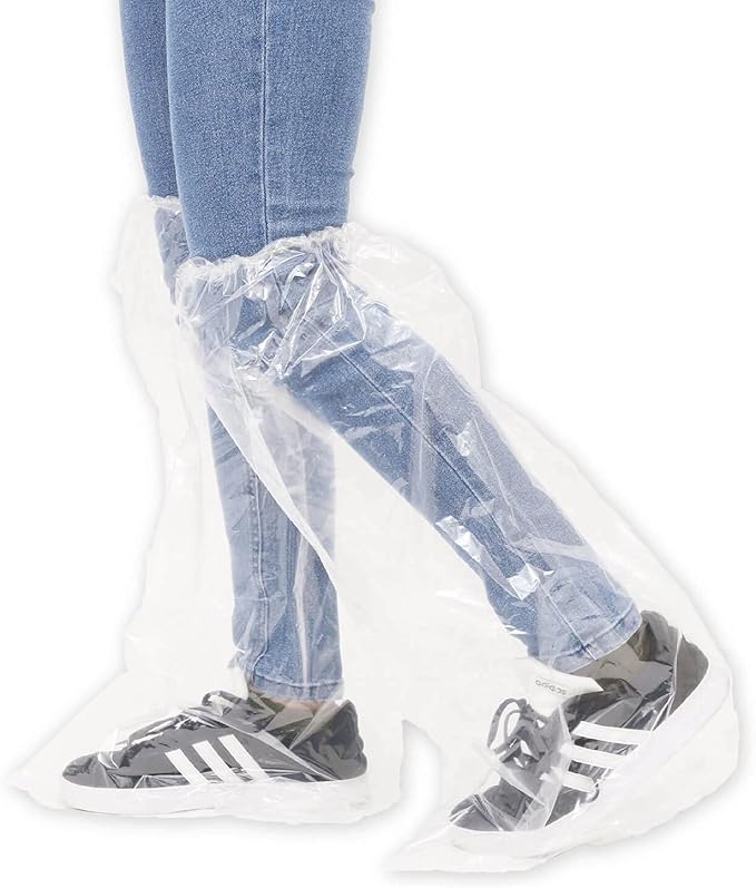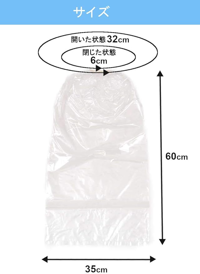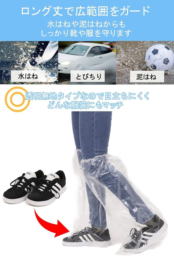 【特徴2】カバーの大きさは、平置きで幅方向35cm、長さ方向は63cm!大切な靴や裾を濡らさない! 合羽や傘では、守りきれない靴やスーツの裾をしっかりカバー! よそ行きの靴でも気にせず雨の中を歩ける! 使い捨てタイプなので、使い終わったらそのままゴミ箱へ。