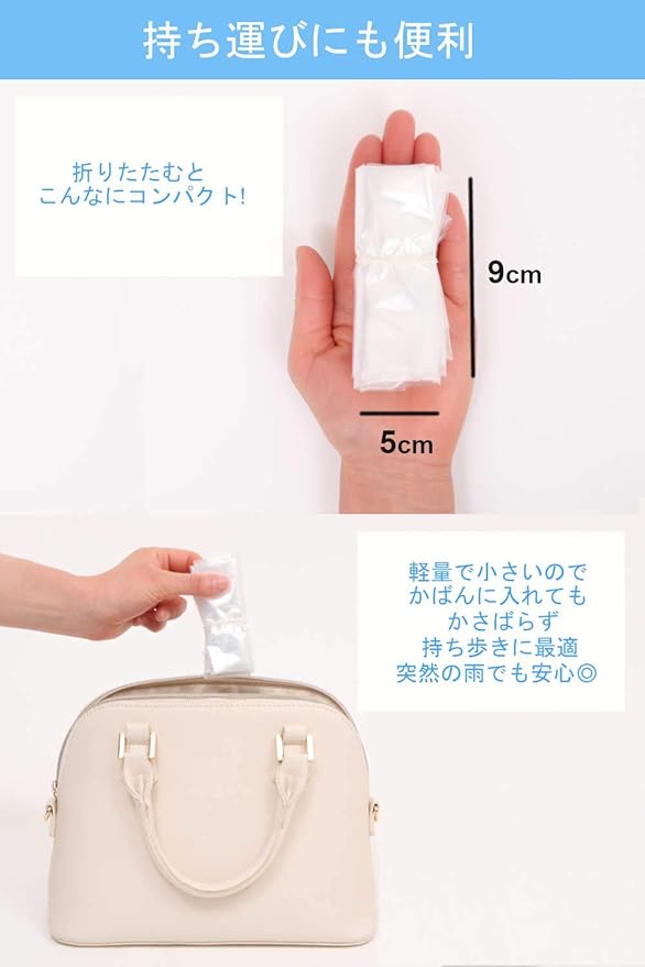 【用途】コンパクトだからカバンに入れて毎日携帯できるのも魅力! 知らないうちの水はね、突然の雨で靴下までびしょ濡れなんてことはなくなります。雨天時の自転車通勤、庭仕事、潮干狩り、洗車自に、大切な靴、ブーツを水から守ります。 その他、お風呂掃除、病院や介護施設でのシャワー時等、足の水濡れ防止にも使用できます。