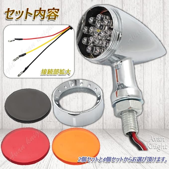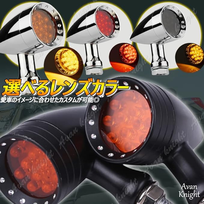 ✅3種類のカラーレンズがセットになった、弾丸型LEDウインカーです。12Vの汎用タイプとなっており、ハーレーやドラッグスター、スポーツスター、アメリカンバイクなど様々な車種のバイクに装着が可能です。配線には、ウインカーだけではなくポジジョン用の配線も付属しているので、ポジジョンランプ(スモールランプ)としてもご使用いただけます。ウインカーを始め、ヘッドランプやテール、ブレーキランプ、フォグランプなどいろいろなランプのLED化が流行っていますので、是非この機会にお洒落なLEDウインカーでライト周辺のDIYをはじめてみられるのはいかがでしょうか。