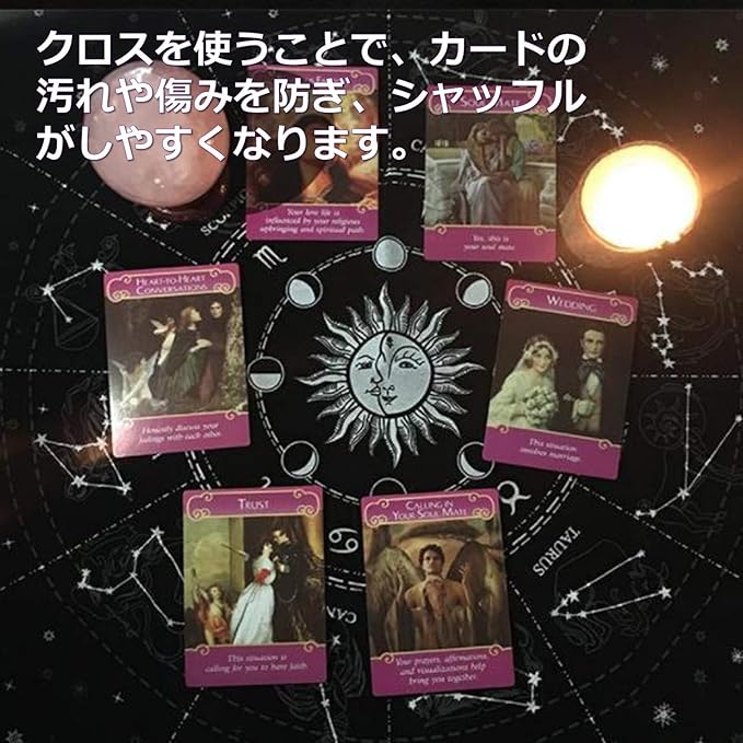 クロスを使うことで、カードの汚れや傷みを防ぎ、シャッフルがしやすくなります。 オラクルカードやタロットカードを使ったタロット占いや、占星術、ルーンストーン、ペンデュラムを使ったダウジングやホロスコープ、ヒーリング、浄化に使えます。