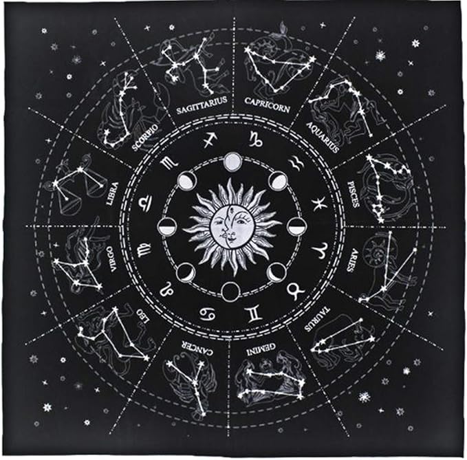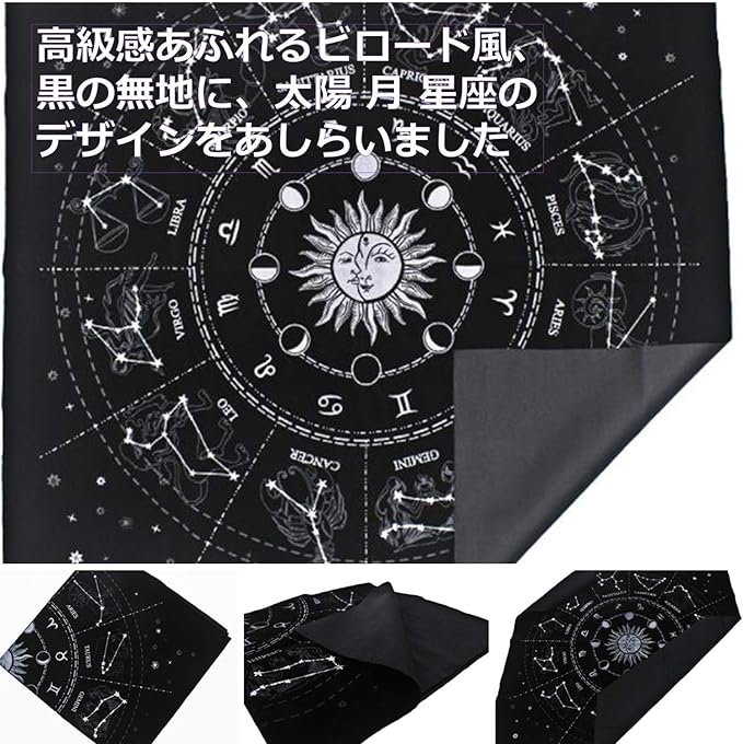 高級感あふれるビロード風、黒の無地に、太陽 月 星座のデザインをあしらいました。 神秘的で美しく、テーブルクロスやタペストリーとしても使えます。