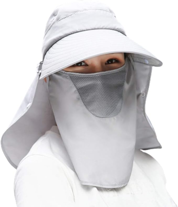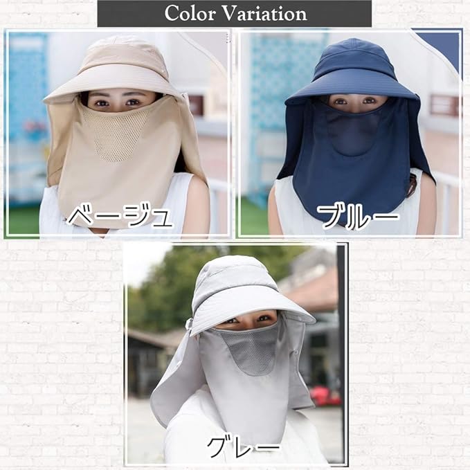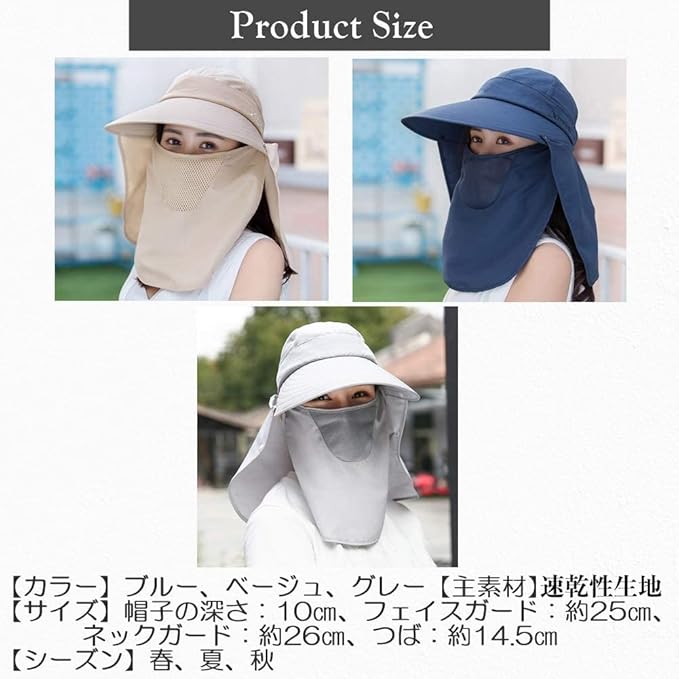 【カラー】ブルー、ベージュ、グレー【主素材】速乾性生地(ナイロン)【サイズ】帽子の深さ:10㎝、フェイスガード:約25㎝、ネックガード:約26㎝、つば:約14.5㎝【シーズン】春、夏、秋