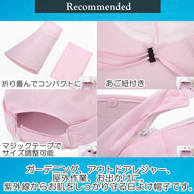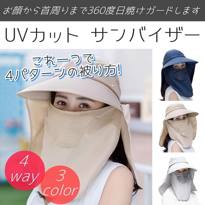 "ガーデニング、アウトドアレジャー、屋外作業、お出かけに。紫外線からお肌をしっかり守る日よけ帽子です。取り外しできるフェイスガードとネックガードを付ければ、お顔から首周りまで360度守れます。これ一つで4パターンの被り方ができます。