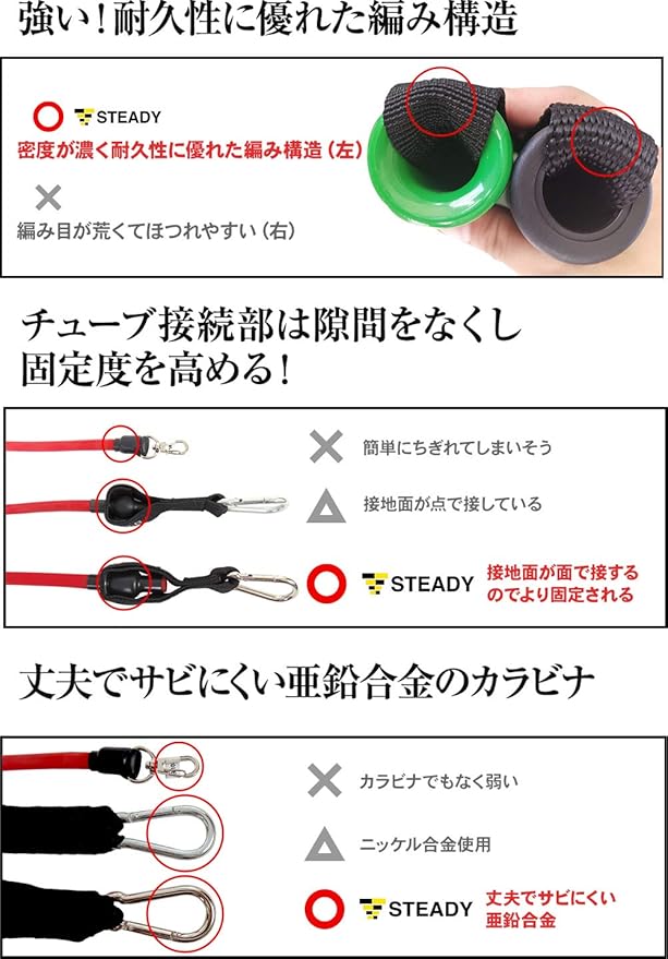 【 他社さんを徹底研究 】 フィットネス大好きメンバーが集まる.に他社さんの製品を取り寄せ、【 自分自身が心から使いたいトレーニングチューブ】をテーマに会議を重ねました。工場に依頼していくつもサンプルを作成した自信の製品です! 13か所の改良点!・負荷の見やすさ ・チューブの厚み改善・耐久性に優れた編み構造・チューブ接続部の固定度・亜鉛合金のカラビナ .