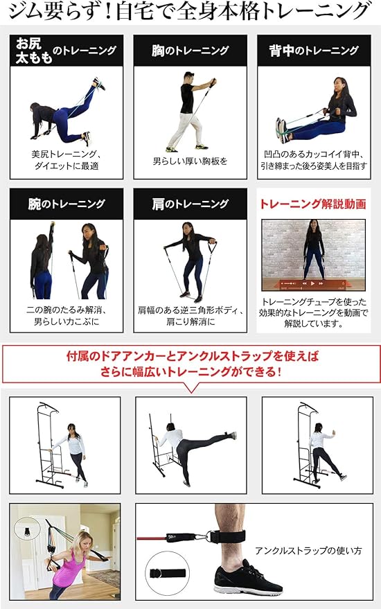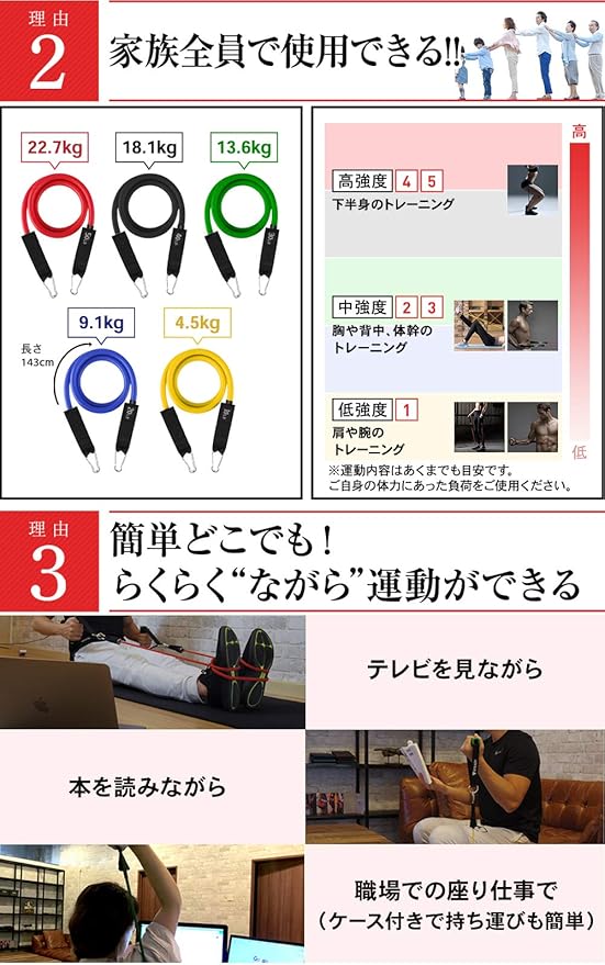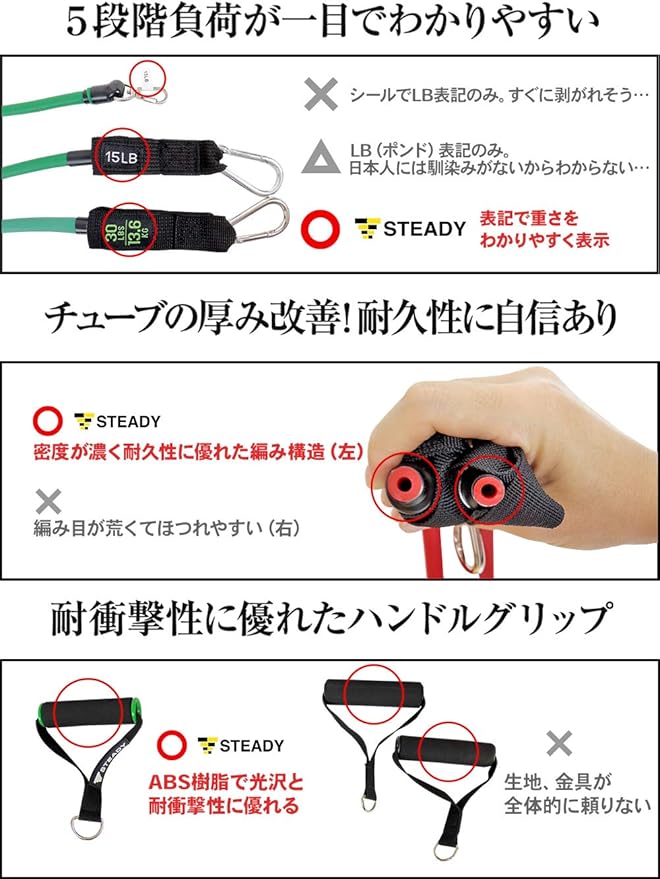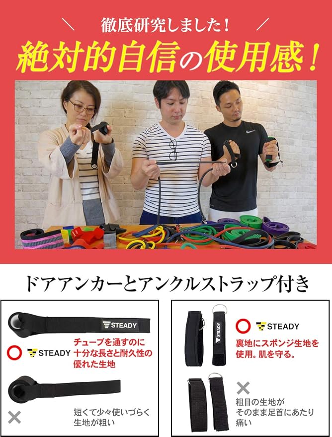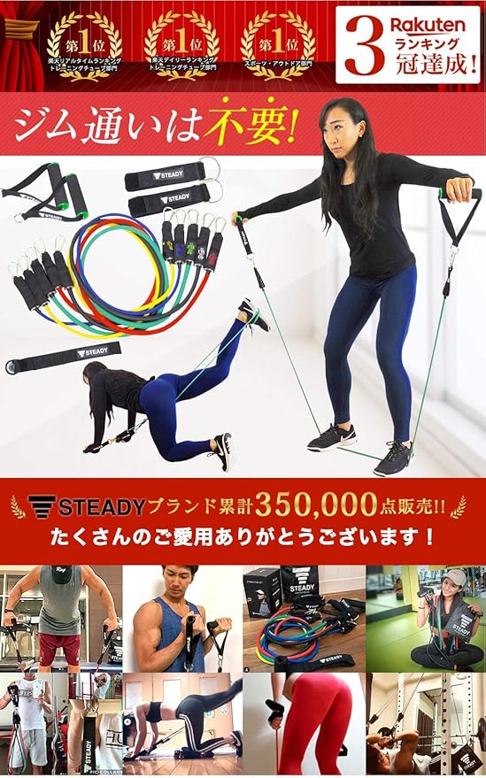 【 STEADYブランド累計60万点販売 】 メディア掲載多数、SNSでも話題の自宅フィットネス器具ブランド 【 ジムに行く必要なし 】 自宅で簡単らくらく全身トレーニング!トレーニングチューブがあれば背中、腹筋、大胸筋、腕、肩まで鍛えられます。 どこでも「ながら運動」コンパクトにまとまるので、どこでも持ち運び、職場のお仕事中や移動中でも運動ができます。 【 家族全員で使用できる 】負荷が5段階あるので、力のない女性やお年寄りもケガのリスクが小さく、目的に応じて負荷を使い分けできます。 ・二の腕、お腹の引き締め、美尻・肩、腰、背中のストレッチ、インナーマッスル・体幹トレーニング .
