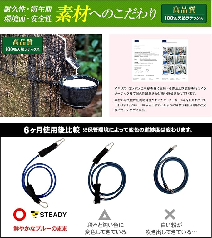 【 絶対的自信の使用感 】 【 使いやすさへのこだわり 】・負荷の重さが一目でわかりやすい・収納袋があるから持ち運びが楽・ドアアンカーとアンクルストラップ付属 【 トレーニング解説動画 】現役パーソナルトレーナーKeiko氏による、フィットネスチューブを使ったトレーニング動画 【 耐久性へのこだわり 】・最も耐久性に優れた自然素材である100%天然ラテックス使用・イギリスに本拠を置くインターテック社で耐久性試験を受け高い評価 【 素材へのこだわり 】世界的に高品質を認められたマレーシア産の天然ラテックス 【 衛生面へのこだわり 】マレーシア産天然ラテックスは抗菌性に優れ衛生的 【 環境へのこだわり 】土に埋めれば自然に帰る、環境にもやさしくエコ .