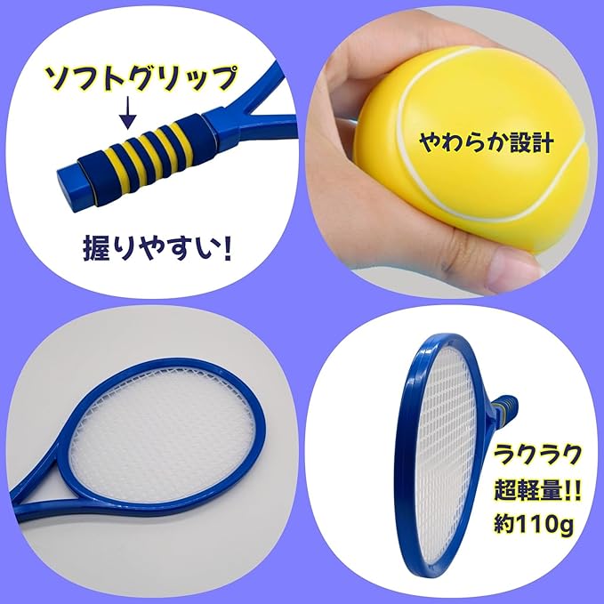 ラケットのグリップ部分は柔らか設計になっているので、持ちやすく、握りやすく、しっかりと打つことが出来ます。 また、コンパクト設計だから持ち運びのラクラク!家や車の中での収納も場所を取りません。