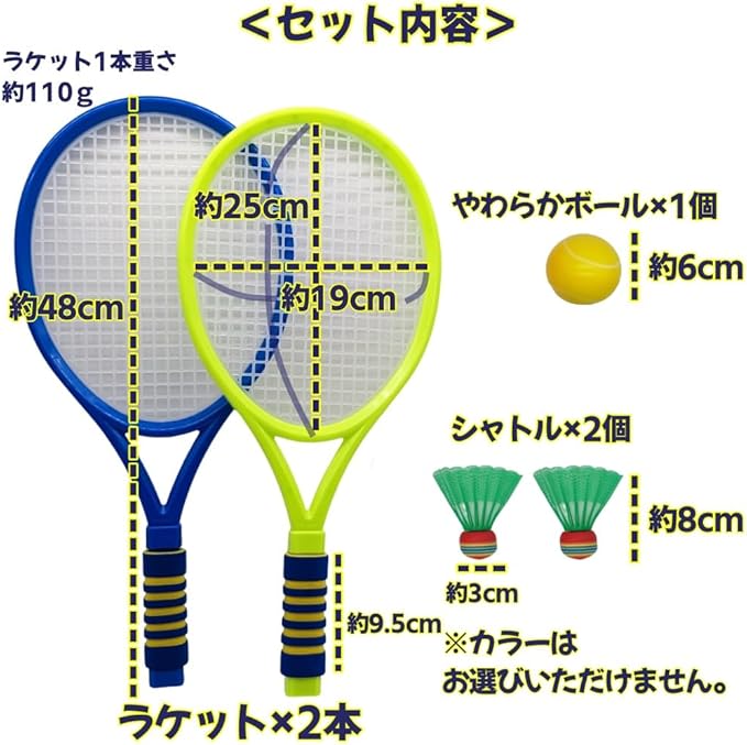 ラケットサイズは長さが約48cm、重さが約110gで超軽量!お子様でも取り扱いしやすい重さです◎!ボールの直径は約2cmのやわらかボールだから安心して 遊べます。羽は約8cmの柔らか仕様です。
