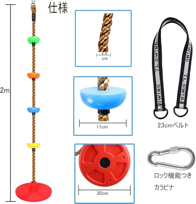 【仕様】サイズ:円盤(大):30*11cm;円盤(小):11*3.8cm;ロープ長さ:2m;包装サイズ:32*16*32;重量:1.8kg;耐荷重150kg;※必ず安全に留意して取り付け、ご使用ください。※地面にクッション性能が高いマットを敷くことはおすすめです。※安全のため、小さなお子様は必ず保護者の監督のもとで使用してください。