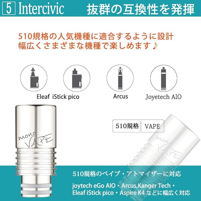 【適合環境】: 標準サイズの510規格に対応(Joyetech AIOやiStick pico等にも対応可能)※aspire K4の純正アトマイザーでご利用の場合、元からついているワイドボアのカバーを外し、ご装着下さい。ploomtech(プルームテック)たばこ カプセル にも対応可能なサイズです。