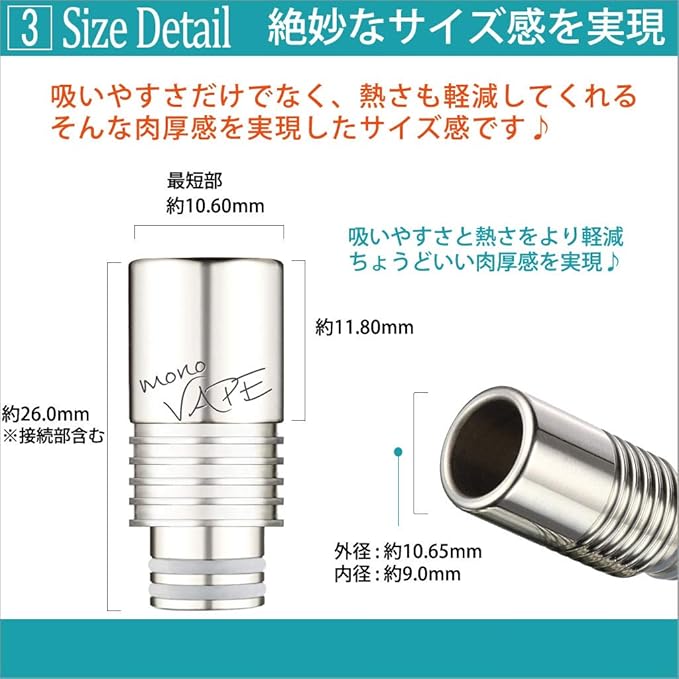 【サイズ詳細】: 長さ約26.0mm(接続部を含む)・外径約10.65mm、内径約9.0mm 【ご使用前のご注意】ひとつひとつ手作業にて、包装してお届けしております。当商品(ドリップチップ)は、安全面を考慮し、個別パッケージにてお届けしております。ご使用前にお気になさる場合は、中性洗剤等で洗浄後にご使用を推奨します。
