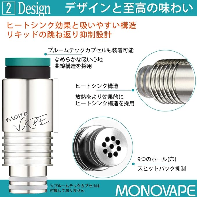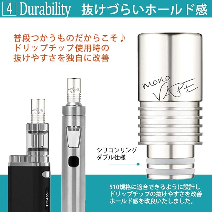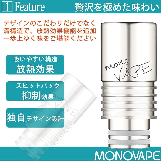 【機能詳細】: 二連Oリングとステンレス素材・独特のデザインフォルムとヒートシンク効果を兼ね備えたノッチ(溝)構造を実現させました。通常のドリップチップにはないデザインとノッチ設計により、ヒートシンク効果を実現。