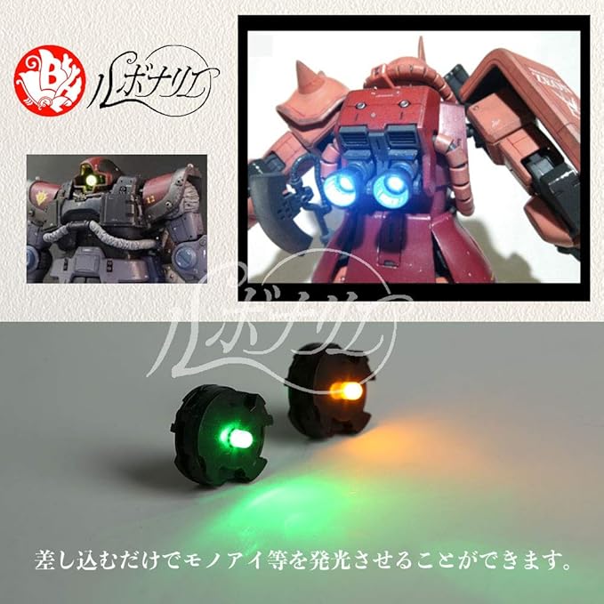 このLED電飾ユニットはガンプラのパーツに対応しているため、差し込むだけでモノアイ等を発光させることができます。