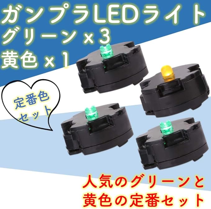 作品ドレスアップの必需品!ガンプラ用LED電飾ユニット4個セットです。人気のグリーンx 3個、黄色 x 1個をセットにしました。
