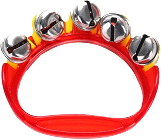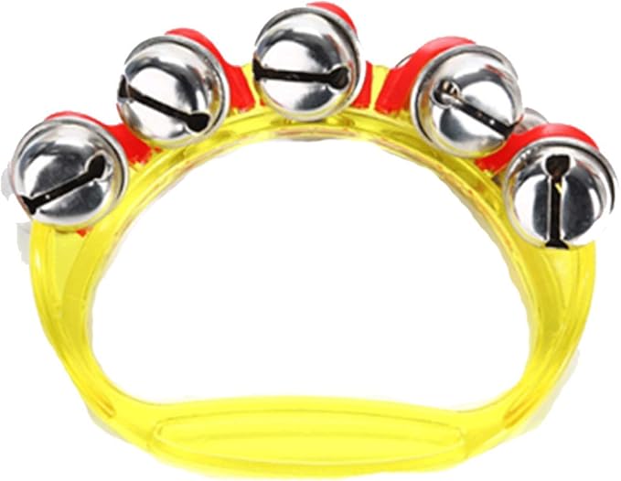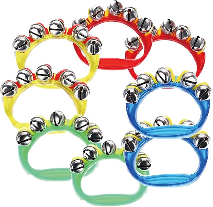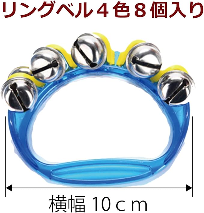 商品内容:1つに5つのベルが左右についたハンドベル 8個入り。カラーは青・緑・黄色・赤の4色が各2個、計8個入っています。