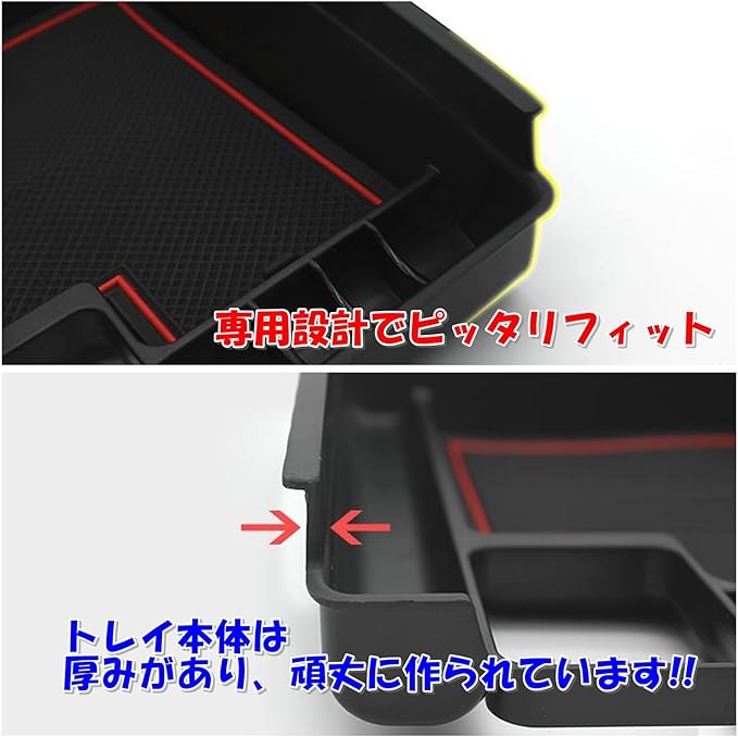 トレイ本体は厚みがあり頑丈!専用設計で取り付けはセンターのコンソールボックスにはめ込むだけでとても簡単♪で、あればとても便利なオススメ商品です。