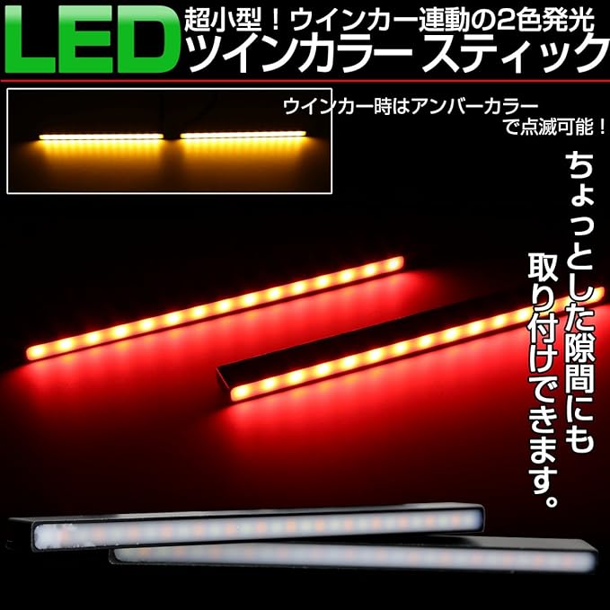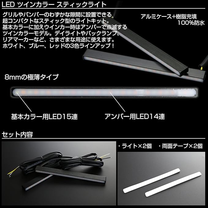 グリルやバンパーのわずかな隙間に設置できる超コンパクトなスティック型のライトキット。 基本カラーに加え、ウインカー時はアンバーで点滅するツインカラーモデル。 デイライトやバックランプ、リアマーカーなど、さまざまな用途に使えます。